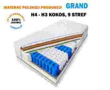 Materac Grand zbudowany jest z wysokiej jakości komponentów. Środkiem materaca są sprężyny kieszeniowe 9 stref obłożone od góry i od dołu pianką elastyczną. Góra materaca zaliczana do kategorii twardej H4 wyposażona jest dodatkowo w matę kokosową umieszczoną na wierzchu. Dolna strona materaca zaliczana do kategorii H3 średnio twardej.
