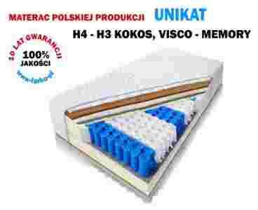 Materac Unikat zbudowany jest z wysokiej jakości komponentów. Środkiem materaca są sprężyny kieszeniowe 9 stref obłożone od góry i od dołu pianką wysoko elastyczną. Góra materaca zaliczana do kategorii twardej H4 wyposażona jest dodatkowo w matę kokosową umieszczoną na wierzchu. Dolna strona materaca zaliczana do kategorii H3 średnio twardej, wyposażona jest dodatkowo w piankę termo elastyczną Visco Elastic (memory ).