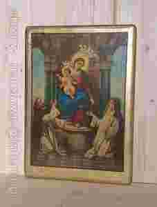 Nierówności są celowe i wraz z delikatną siatką spękań i patyny nadają stylowy stary charakter ikonie. Ten ciekawy efekt został osiągnięty dzięki własnej technice z udziałem transferu.