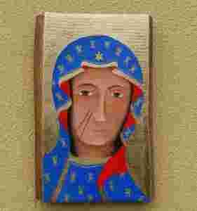 Krystyna Gargas-Gąsiewska. ,,Matka Boska Częstochowska’’ (052) Ikona ręcznie pisana zgodnie z Tradycją, na desce topolowej 15,5x24x3 cm z naklejonym płótnem wielokrotnie gruntowanym zaprawą klejowo-kredową. Do złoceń zostały użyte płatki szlagmetalu (kolor 2,5) przyklejone na mikstionie i zabezpieczone szelakiem. Ikona pokryta werniksem UV