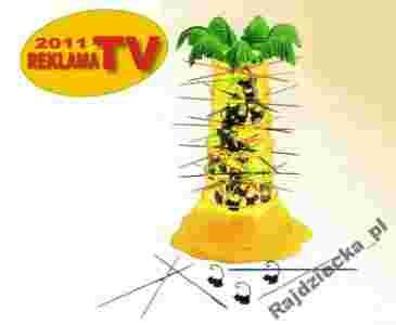 op. 32,5x9x27 cm REKLAMA TV: od 15 listopada do 15 grudnia, 2013. Opis produktu: Gracze wkładają małpki do palmy i wyjmują patycznki w kolorze, który losują rzucając kostką. Kto zbierze najmniej małpek, wygrywa! Gra nie wymaga umiejętności czytania i jest idealna dla młodszych dzieci, lecz także rodzice będą się bawić doskonale! Gra wymaga zręczności i buduje na pięcie. Jest łatwa do nauczenia i zabawna. To wciąga! Zawartość pudełka: 1 drzewo, 30 małp, 30 patyczków w trzech kolorach, 1 kostka, instrukcja. Gra przeznaczona: dla 2 do 4 graczy, w wieku od 5 lat.
