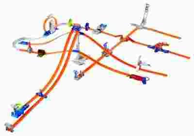 Wypuść na tor pięć samochodów w czterech kierunkach i ropocznij widowiskową zabawę! Wspinaj się na niebotyczne rampy i zjeżdżaj z samej góry, ciesząc się oszałamiającą prędkością. Ścigaj się z samolotem, skacz przez płomienie i weź udział w emocjonującym wyścigu na torach równoległych! Wieża zawiera pełny układ torów.