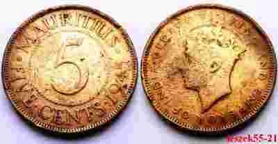 MAURITIUS BRYTYJSKI 5 CENTS 1945 GEORGE VI RZADKA