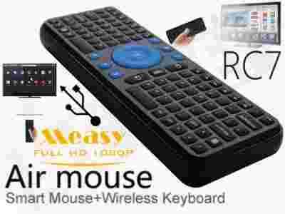 Measy RC7 to pełnowymiarowa i wyjątkowo wygodna klawiatura, którą połączono z tradycyjną myszką komputerową. Z odbiornikiem komunikuje się za pomocą technologii 2,4 GHz, która pozwala na obsługę urządzeń w bardzo dużych pomieszczeniach.RC7 posiada klawisze w standardzie QWERTY w tym klawisze funkcyjne i przyciski, odpowiadające prawemu i lewemu przyciskowi myszki. Wyjątkową wygodę zapewnia tzw. Air Mouse, która pozwala na sterowanie kursorem po ekranie za pomocą ruchu nadgarstkiem w powietrzu. Urządzenie zasilane jest przez 3 baterie AAA.