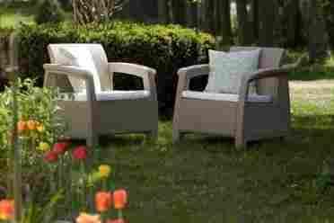 Ten piękny, o wiklinowej fakturze zestaw składa się z dwóch krzeseł i stolika. Zestaw jest dostępny w brązie, jasnym brązie, antracycie, kremie oraz zawiera poduszki. Produkowany z trwałych, materiałów łatwy w konserwacji, został zaprojektowany w celu zapewnienia komfortu przez wiele lat użytkowania.