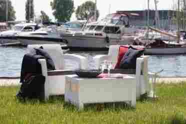 Meble są bezobsługowe, wykonane z tworzyw sztucznych odpornych na wpływy atmosferyczne i promienie UV, są wyjątkowo trwałe i mogą być pozostawione na zewnątrz przez cały rok.