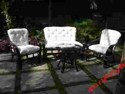 w zestawie znajdują się poduchy w kolorze ecru pikowane posiadające wiązania służące do umocowania siedzisk co sprawia że poduchy są stabilne. Grubość siedzisk jak również oparć to 13 cm.