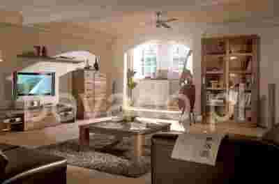 Fascynacja egzotyką natrafiła tu n szlachetny wystrój. W tym idealnym zestawieniu dominują jasne i kontrastujące ze sobą formy mebli. Ciepły ton forniru orzecha amerykańskiego stwarza komfortową atmosferę dla domu. Oświetlenie halogenowe na półkach szklanych i TV podkreślają harmonijne efekty świetlne.