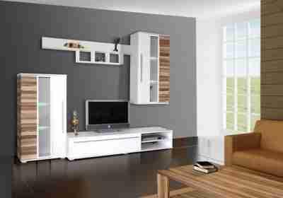 Komplet wykonany jest z płyty lakierowanej białej , fronty z płyty wiórowej laminowanej po części w kolorze orzech Baltimore , obrzeża wykończone okleiną PCV , uchwyty wykonane z tego samego tworzywa . Meblościanka w paczkach do samodzielnego montażu , w której znajduje się również instrukcje i niezbędne akcesoria. Szczerze Polecamy!!
