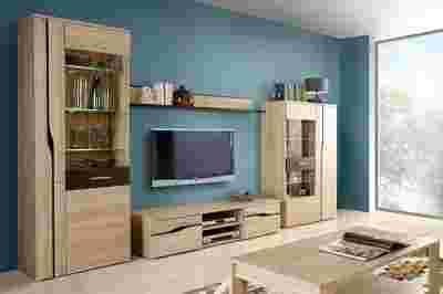 Meblościanka Duo składa się z: wysokiej witryny, szafki RTV, półki i szerokiej witryny.