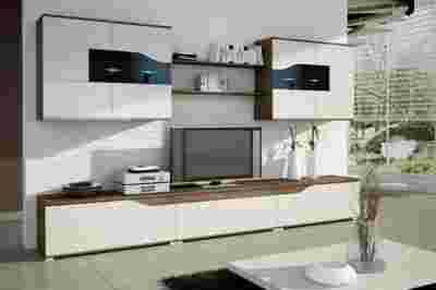 Komplet wykonany jest z płyty laminowanej 16mm , fronty z płyty wiórowej lakierowanej po części na czarny wysoki połysk , obrzeża wykończone okleiną PCV , uchwyty wykonane z tego samego tworzywa, półki szklane 8mm podświetlane lampkami LED - niebieskimi. Meblościanka w paczkach do samodzielnego montażu. Znajdą w niej Państwo również instrukcję i niezbędne akcesoria.