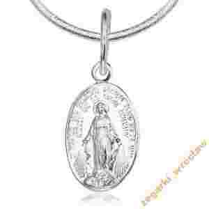 Srebrna zawieszka w kształcie medalika. Prezentowany model wykonany z diamentowanego srebra próby 925.