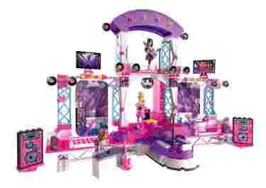 Super Rockowa Scena 80247. Przygotuj się na rockową imprezę! Barbie i jej przyjaciele organizują dziś wielki koncert i spodziewają się wielu widzów. Zbuduj z klocków Mega Bloks ogromną scenę złożoną z pięciu platform. Na każdy koncert przebuduj ją, aby znowu zaskoczyć wiernych fanów Barbie. Masz do wyboru dwa tryby. Tryb pierwszy pozwala wybrać prawdziwe multikolorowe światła oraz jeden z czterech największych hitów, które bez wątpienia rozkołyszą publiczność. Tryb drugi pozwala wybrać dowolną muzykę – śpiewaj lub graj, a światła koncertowe będą błyskały w rytm tego, co wykonujesz. Zrób taki koncert, którego fani nie będą mogli zapomnieć. Specjalne elementy sceny, jak srebrne rusztowania, ogromne wzmacniacze czy błyszczące klocki lub połyskująca kula disco, zapewnią odpowiedni nastrój do każdej piosenki. Wysięgnik i ogromny ekran pozwolą zobaczyć koncert Barbie nawet oddalonej publiczności. Włącz światła, sprawdź nagłośnienie, poprowadź kamerę i rozpocznij koncert z udziałem Barbie, Raquelle i Teresy. Dziewczyny dadzą czadu, grając na keyboardzie i gitarach.