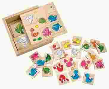 W zestawie 24 sztuki klocków tj. 12 par klocków z wesołymi przyjaciółmi z łąki. Znajdziecie tu Waszych ulubieńców z głębin: delfiny, foki, skalary, kraby, koniki morskie i inne.