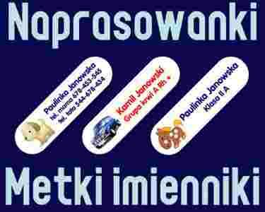 Zapraszamy do zakupu metek imiennych , imienników , naprasowanek . jest to doskonały sposób na oznaczenie garderoby naszych pociech,przed pomyłkami , kradzieżą oraz zagubieniem .oznaczyć możemy np: odzież , worek , plecak torba do szkoły oraz wiele innych rzeczy .na metce możemy umieścić wszystkie niezbędne dane adresowe to w wypadku ludzi starszych ,którzy maja czasami problem z pamięcią a dla dzieci umieścić możemy grupę krwi , telefon kontaktowy do rodzica lub rodziców .wymiar metek : 13 mm x 46 mm jako jedyne posiadają zaokrąglone rogi , można je prać w temperaturze do 60 stopni !!! łatwa aplikacja wystarczy odkleić metkę od materiału podkładowego i zaaplikować na materiał ( to nie są metki wycinane nożyczkami jak na innych aukcjach , gdzie trzeba się jeszcze męczyć z oddzieleniem warstw metki od podkładu ) .naprasowujemy je zwykłym żelazkiem , szczegółowa instrukcja wprasowania dołączona do przesyłki.metki wykonane są z wysokiej jakości produktów .na tkaniny jasne oraz ciemne ! na innych aukcjach znajdziesz też nalepki , naklejki w takiej samej formie co prasowane metki , które ułatwią oznaczenie przedmiotów należących do twojego dziecka . metki oraz naklejki posiadają białe tło . kolory napisów do wyboru : czarny , niebieski , czerwony , granatowy .tylko zakupy u nas gwarantują ci wysoką jakość produktów oraz to , że je na pewno otrzymasz . jesteśmy legalnie działającą firmą ! nasze metki oraz naklejki produkujemy na specjalistycznych maszynach , a nie na domowych drukarkach i wycinanych nożyczkami . największy wybór najfajniejszych obrazków ( ponad 300 ) na allegro !wzór zamówienia 1. numer obrazka np : ( 135 lub bez obrazka ) 2. kolor czcionki np : ( niebieski ) 3. tekst np : linia 1 : natalia romanowska ( max 20 znaków ) linia 2 : tel.mama 666-[zasłonięte]-888 ( max 20 znaków ) linia 3 : tel.tata 689-[zasłonięte]-000 ( max 20 znaków ) uwaga ! przy braku informacji o kolorze czcionki zamówienie będzie wykonane standardowo - czarną czcionką . zapraszam na inne aukcje gdzie dostępne są inne ilości i wzory !!!