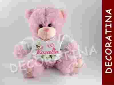 Przedmiotem aukcji jest niebieski lub różowy misiek w koszulce z imieniem.