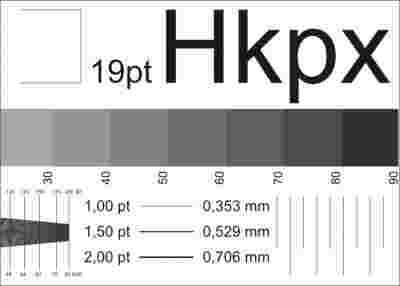 - przykładowe grubości linii (w punktach i w mm)