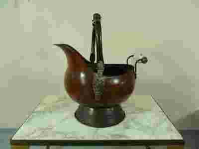 Miedziano-mosięzna weglarka z lwami po bokach. Uchwyty ceramiczne malowane ręcznie.