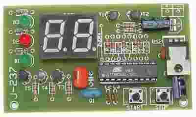 Przyrząd służący do mierzenia czasu reakcji na bodziec zewnętrzny. Zasada działania urządzenia jest prosta: po załączeniu zasilania na wyświetlaczu zostaną wyświetlone poziome kreski, naciśnięcie przycisku start spowoduje rozpoczęcie odliczania i będą na przemian migały dwie diody, po zapaleniu się czerwonej diody należy jak najszybciej przycisnąć przycisk stop. Zwłoka reakcji w setnych sekundy zobrazowana zostanie na 2 cyfrowym wyświetlaczu. Zestaw zbudowany jest na jednej płytce o wymiarach 87x50mm. Układ wymaga zasilania 9...12V Instrukcja do J-237