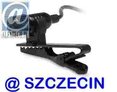 Uniwersalny mikrofon przewodowy przeznaczony między innymi do komunikacji internetowej, przypinany do odzieży za pomocą metalowego klipsa.