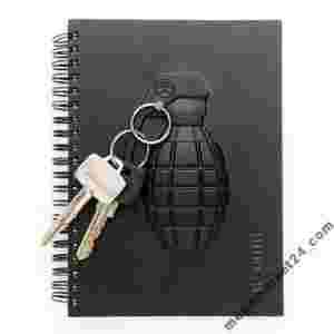 • notes z czarną twardą okładką i odwzorowaniem granatu w 3D
