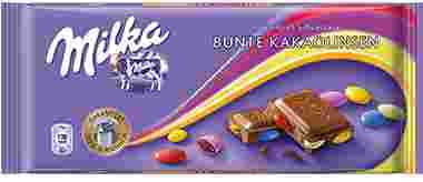 Mleczna czekolada Milka z kakaowymi cukierkami w opakowaniu 100g. Produkt pochodzi z rynku niemieckiego.