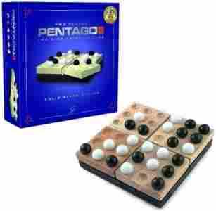 Opis produktu:W pentago zasady gry są proste. Wygrywa ten, kto pierwszy ustawi pięć kul jednego koloru w jednym rzędzie. Prawdziwym wyzwaniem tej znakomitej gry jest dynamiczna zmiania ułożenia kul na planszy poprzez obrócenie dowolnej platformy po każdej nowo dostawionej kuli. Bezmiar mozliwości sprawia, że gra świetnia rozwija wyobraźnię. Wygrywa ten, kto pierwszy ustawi pięć kul w jednym rzędzie.Zawartość pudełka:4 drewniane platformy, białe i czarne kule, instrukcja.Gra przeznaczona:dla 2 graczy w wieku od 8 lat.