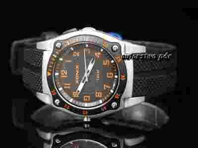 Zegarek zaprojektowany dla osób prowadzących aktywny styl życia . Koperta dobrze dopasowana do paska , szkło syntetyczne . Pasek szeroki w kolorze czarnym , wykonany ze specjalnego miękkiego latexu . Tarcza czarna - podświetlana , cyfry bardzo dobrze czytelne w kolorze pomarańczowym , z boku koperty znajduje się wbudowana mała latarka , która daje mocne światło ( patrz ostatnie zdjęcie ) . Można np. poświecić sobie na zamek w drzwiach , aby bez problemu trafić kluczem . Zegarek jest wodoszczelny , można w nim pływać i nurkować , ale nie na dużych głębokościach , wszystko jest opisane w instrukcji obsługi , która jest załączona do zegarka .