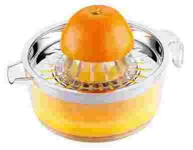 Wyciskacz do cytrusów zawiera w zestawie 2 stożki na małe i duże owoce i antypoślizgowy pojemnik z podziałką pojemności do 600 ml.