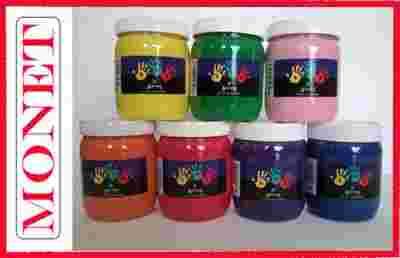 Farby wodne do malowania rękoma stworzone specjalnie dla dzieci powyżej 3 roku życia. Odznaczają się gęstą, kremową konsystencją i nadają się do malowania na papierze, kartonie, drewnie, kamieniu, styropianie oraz szkle. Farby są produkowane bez udziału rozpuszczalników, metali ciężkich oraz innych szkodliwych substancji i odznaczają się najwyższą klasą jakości. Wszelkie zabrudzenia można zmyć wodą przed wyschnięciem farby.