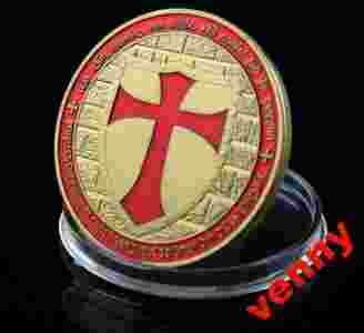 Na monecie wokół czerwonego krzyża motto Templariuszy po łacinie:
