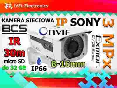 Kamera megapixelowa BCS-TIP7300IR to profesjonalna kamera tubowa IP. Kamerę wyróżnia doskonała jakość obrazu oraz wysoka czułość, dzięki zastosowaniu wysokiej jakości przetwornika 1/2.8" 3MP EXMAR CMOS z systemem operacyjnym LINUX. Kamera posiada regulowany obiektyw 8-16mm z automatyczna przysłoną oraz diody podczerwieni o zasięgu do 30 metrów.
