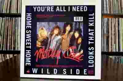 Boxset zawierający singiel Motley Crue, naszywkę Harley Davidson, naklejkę i plakat.