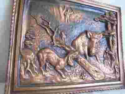 MOTYW POLOWANIE - DZIK,PSY,MYŚLIWY,DRZEWA - MIEDŻ