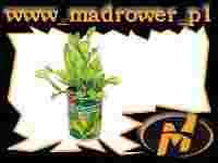 Muchołówka z puszki. Roślinka posiada liczne liście wąskie u nasady i rozszerzające się ku końcowi. To one stanowią owadożerną pułapkę.