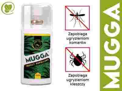Mugga spray to produkt do stosowania na odsłonięte części ciała oraz odzież. Ma działanie odstraszające przeciwko komarom, muchom krwiopijnym, kleszczom, gzom. Preparat zabezpiecza przed ukąszeniem przez 8 godzin od zastosowania. Spryskiwać odzież lub/i odsłoniętą część ciała z odległości około 20 cm.