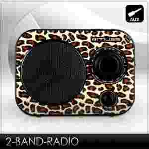 2-pasmowe radio z designem o fakturze skóry leoparda, z wejsciem AUX do podlaczania zewnetrznych zródel audio.