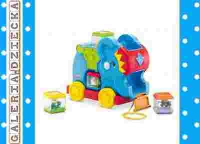 Ten słonik jest pełen muzyki, dźwięków i fantastycznie tańczących klocków. Połóż klocek na siodle słonia. Teraz wystarczy, że dziecko popchnie lub pociągnie słonika, a klocek zacznie się obracać. Słonia można ciągnąć za sznurek, odtwarza trzy melodie , można do niego wrzucać cztery interaktywne klocki. Każdy klocek ma inny element w środku: małpka, tygrysek, klaun i lustereczko. Jeśli dziecko będzie poruszać słonikiem w przód lub tył to usłyszy melodyjki. Jeśli wrzuci klocki do środka to słonik się odezwie.