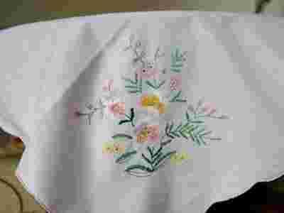 Piękna, haftowana serwetka. Kolor biały. Maszynowo haftowane kwiaty, obszta różową nitką.