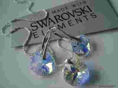 Kryształy w kolczykach zawieszone są na eleganckich srebrnych biglach angielskich. Natomiast zawieszka osadzona jest na srebrnej krawatce. Łańcuszek o oryginalnym i pięknym splocie wykonany jest ze srebra próby 925. Na krawatce i biglach angielskich wybita jest próba 925 i dodatkowo dołączona jest metka jubilerska.
