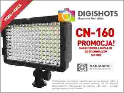 Lampa do kamer i aparatów cyfrowych z funkcją filmowania - model CN-160. Duża powierzchnia reflektora wyposażona jest w 160 diod co w efekcie daje bardzo dobre, białe światło na odległość do 6-7 metrów, dzięki czemu uzyskujemy równomiernie oświetlony pierwszy plan.