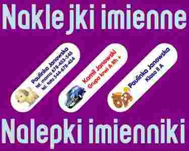 Zapraszamy do zakupu naklejek imiennych , imienników , naprasowanek .jest to doskonały sposób na oznaczenie przedmiotów naszych pociech przed pomyłkami oraz zagubieniem .oznaczyć możemy wszystkie przedmioty o gładkiej powierzchni np: przybory szkolne , zeszyty , książki ,zabawki .na naklejce możemy umieścić wszystkie niezbędne dane .wymiar : 13 mm x 46 mm jako jedyne na allegro zabezpieczone są specjalnym laminatem , który zapobiega zarysowaniom oraz ścieraniem się druku .nieodzowne do szkoły na przybory szkolne , do piaskownicy , przedszkola .wodoodporne , odporne na czynniki atmosferyczne tj :światło , woda , można je myć w zmywarce do 60 stopni . łatwa aplikacja wystarczy odkleić naklejkę od materiału podkładowego i zaaplikować na przedmiot .naklejki wykonane są z wysokiej jakości produktów .na innych aukcjach znajdziesz też metki , imienniki w takiej samej formie co naklejki , które ułatwią oznaczenie garderoby należących do twojego dziecka .metki oraz naklejki posiadają białe tło .kolory napisów do wyboru : czarny , niebieski , czerwony , granatowy .tylko zakupy u nas gwarantują ci wysoką jakość produktów oraz to , że je na pewno otrzymasz . jesteśmy legalnie działającą firmą ! nasze metki oraz naklejki produkujemy na specjalistycznych maszynach , a nie na domowych drukarkach i wycinanych nożyczkami . największy wybór najfajniejszych obrazków ( ponad 300 ) na allegro ! wzór zamówienia 1. numer obrazka np : ( 135 lub bez obrazka ) 2. kolor czcionki np : ( niebieski ) 3. tekst np : linia 1 : natalia romanowska ( max 20 znaków ) linia 2 : tel.mama 666-