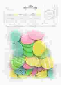 Zestaw naklejek z pianki w kształcie rozbitych jajeczek, pisanek z nadrukiem oraz brokatowych jajek w kilku kolorach.