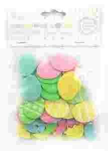Zestaw naklejek z pianki w kształcie rozbitych jajeczek, pisanek z nadrukiem oraz brokatowych jajek w kilku kolorach.