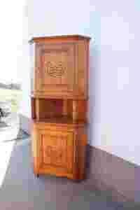 Narożna sosnowa witryna o bogatej snycerce