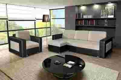 Wypoczynek zaprezentowany został w beżowym szenilu łączonym z czarną eko skórą .