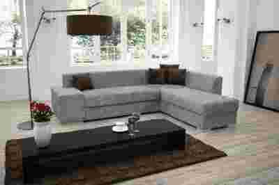 Nowoczesny duży narożnik z funkcją spania dla dwóch osób i pojemnikiem na pościel.