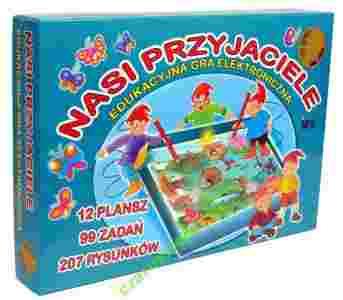 Gra pomaga dzieciom w wyszukiwaniu różnic, w odnajdywaniu i kojarzeniu wspólnych cech oraz w poznawaniu kształtów. W trakcie zabawy dzieci rozwijają analizę i syntezę wzrokową. Na 12 planszach znajduje się 99 zadań. Dzieci poznają zwierzęta i ich zwyczaje, gdzie mieszkają i jakie zostawiają ślady. Przy każdym rysunku umieszczony jest punkt. Jeżeli gracz zna odpowiedź dotyka specjalnymi długopisami odpowiednie dwa punkty na planszy. Przy prawidłowej odpowiedzi lampka zapali się, w przypadku złej - nie. Uwaga: podczas gry umieszczamy w pudełku tylko jedną planszę| przed przystąpieniem do gry należy zainstalować baterie 9V (gra nie zawiera baterii). Gra zawiera 12 tematycznych plansz: 1. Gdzie mieszka zwierzątko? 2. Co myszka trzyma w łapce? 3. Gdzie są te same kolory? 4. Znajdź pasujący obrazek. 5. Co tu pasuje? 6. Gdzie jest zwierzątko? 7. Czyj to cień? 8. Czyje to ślady? 9. Znajdź zabawkę. 10. Znajdź drugą połowę. 11. Policz kropeczki. 12. Liczymy kolorowe plamki.