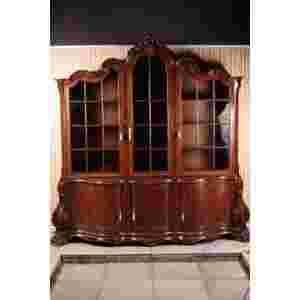 Witryna wykonana na początku XX wieku we Francji. Podstawa trzydrzwiowa oparta na nogach w kształcie łap lwa. Drzwi niezwykle masywne i dobrze zabezpieczające wnętrze. Górna część posiada przeszklone drzwiczki i zakończona jest rzeźbionym naczółkiem. Szkło wysokiej jakości,odporne na uszkodzenia. Całość pokryta misterna snycerką oraz piękną i niezwykle dokładna intarsją. Stan doskonały, wewnątrz jak i na zewnątrz. Mebel będzie niebanalnym elementem w każdym stylowym wnętrzu.
