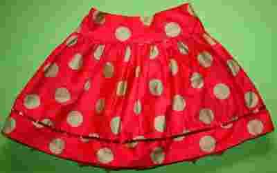 Duże beżowe grochy na czerwonym tle. Na dole pas cekinów. Wewnątrz halka wykończona dekoracyjnie wystającym tiulem. Regulacja w pasie.